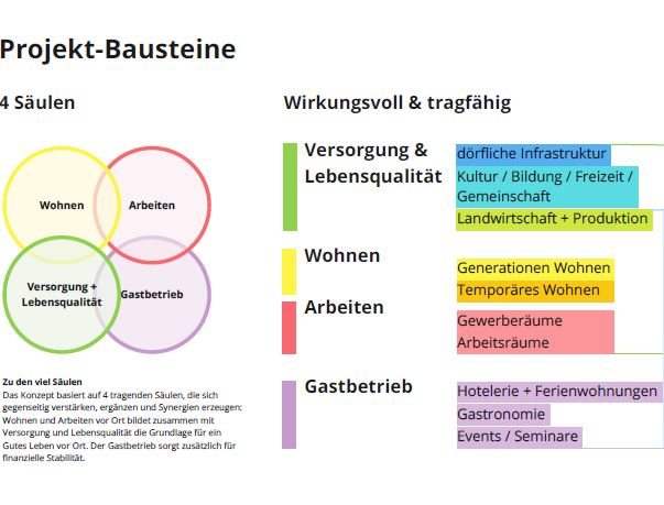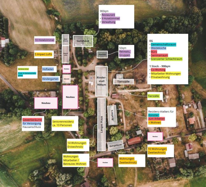 Bis ca. 2035 (Stand 2023) sollen 7 historische Gebäude saniert werden und 5 Neubauten entstehen, in denen insgesamt 100 Menschen Platz haben, Gäste nicht mitgezählt. Es gibt einen Gästebereich, der sich um das bisherige Hotel und Restaurant anordnet. Hier werden auch die 5 Impact Lofts angeschlossen. In direkter Nachbarschaft findet sich der öffentliche Bereich mit Hofladen, Kindergarten und dem großen Rinderstall als multifunktionaler Treffpunkt. An den öffentlichen Bereich schließt sich der Wohnbereich an: Mitarbeiterwohnungen, Seniorenresidenz, betreutes Wohnen, Erst- und Zweitwohnsitze, ergänzt um Residenz-Ateliers und multifunktionaler Gewerberäume für Versorgungsangebote.
